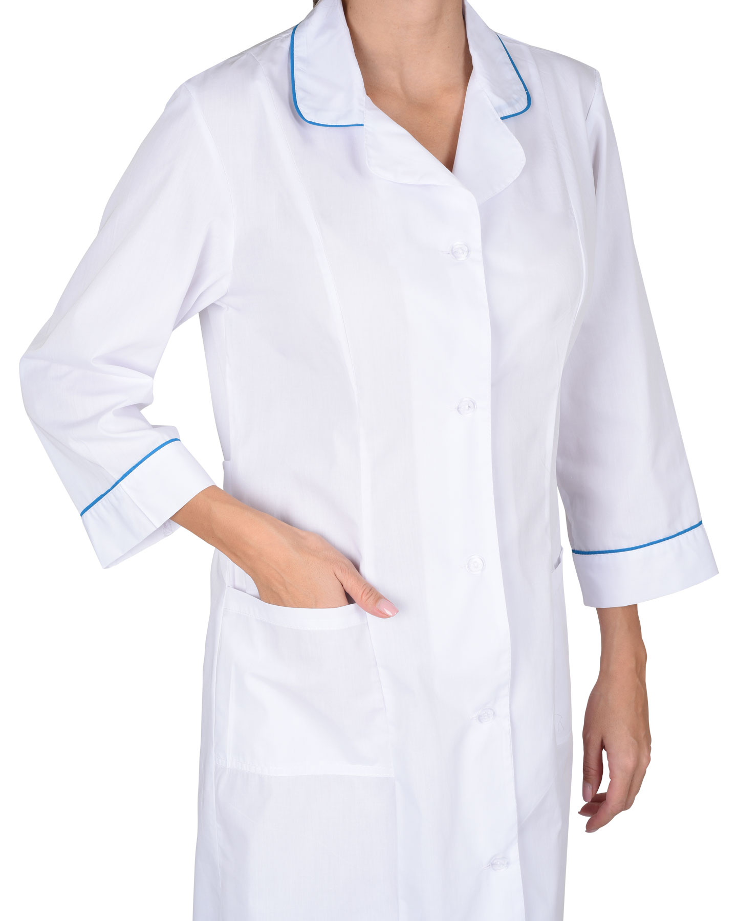 Халат с отложным воротником и нижними накладными карманами, по вороту и манжетам рукавов отделка в виде канта контрастного цвета. Рукава 3/4. Цвет отделки: Бирюзовый.