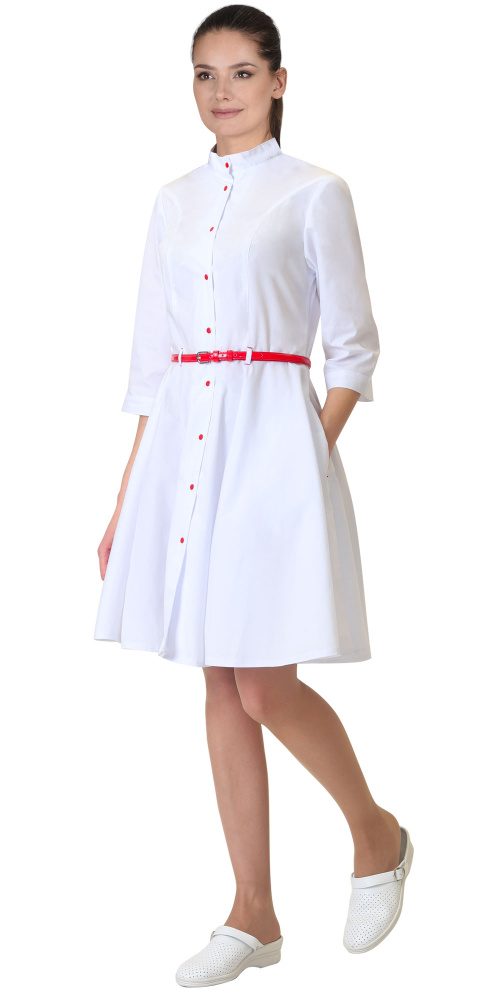 Халат женский прилегающего силуэта, с центральной застёжкой на кнопки. Втачной воротник стойка. Внутренние карманы в боковых швах. Юбка солнце-клеш. Рукава втачные 3/4. Съёмный ремешок.