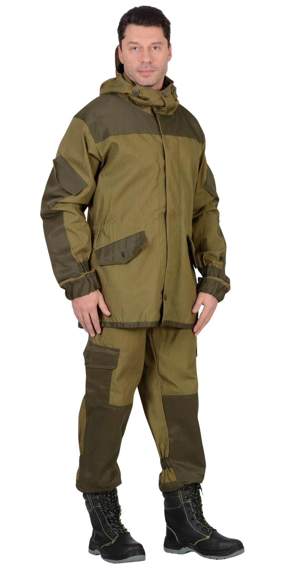 Брюки прямого силуэта, с пристёгивающимися помочами (подтяжки), с гульфиком застегивающимся на пуговицы, с цельнокроеным поясом частично стянутым резинкой и застегивающимся на пуговицы, с разными многофункциональными карманами. С усилительными накладками. Низ брюк на резинке.