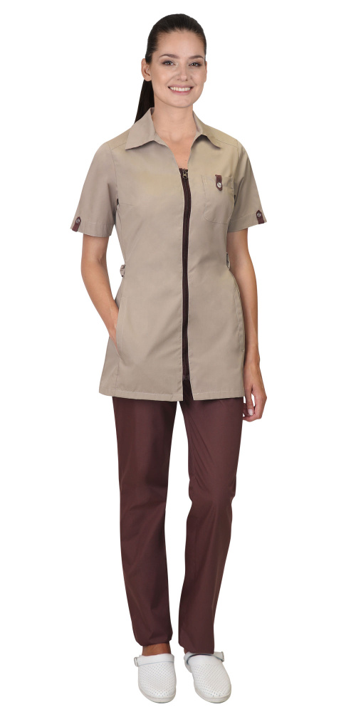Костюм женский комбинированный из ткани двух цветов состоит из блузы бежевого цвета и брюк шоколадного цвета.