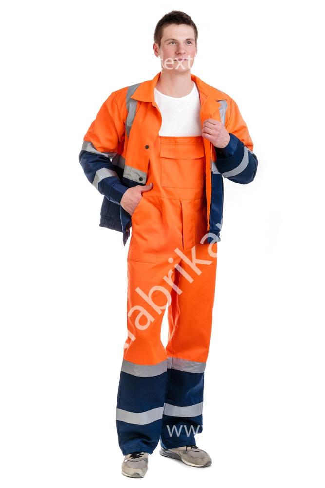 Полукомбинезон с потайной застежкой на пуговицы в переднем шве с двумя накладными и одним нагрудным карманом; бретелями, частично состоящими  из эластичной ленты, застегивающимися на фастексы, двумя полосами СОП шириной 5 см.