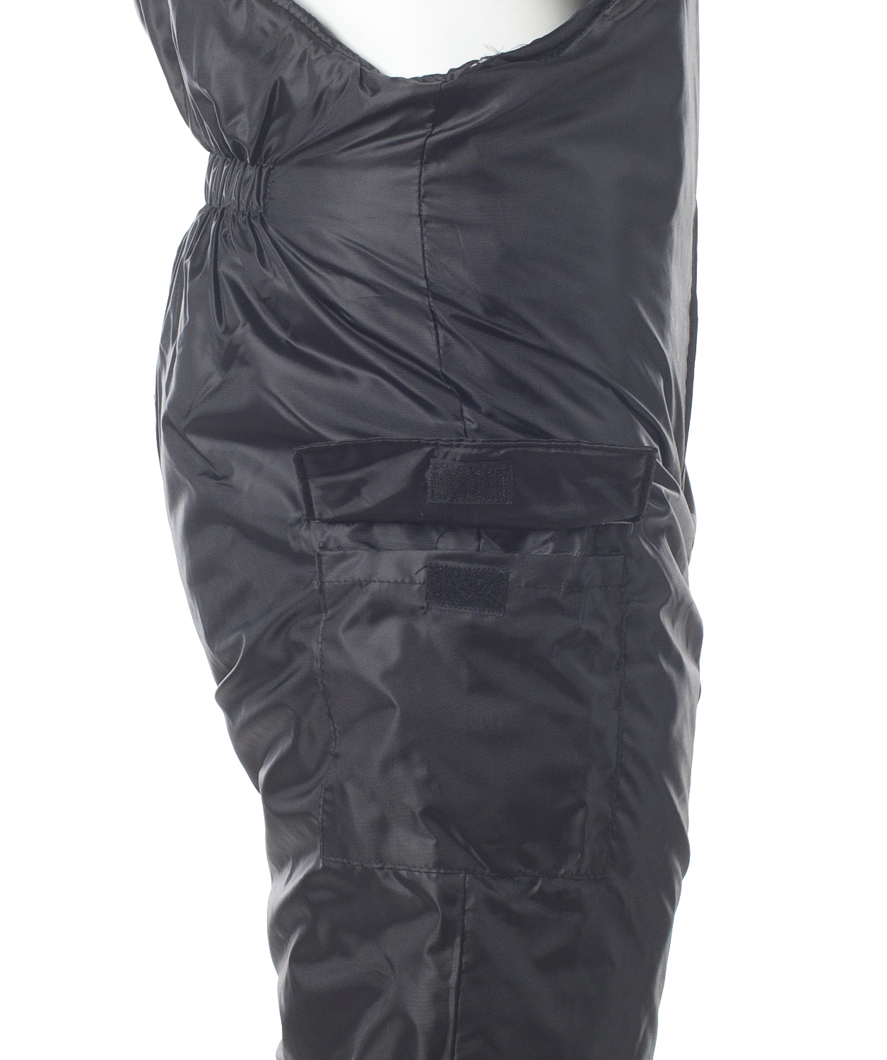 Полукомбинезон с накладными карманами и клапанами на липучках на боковых швах.