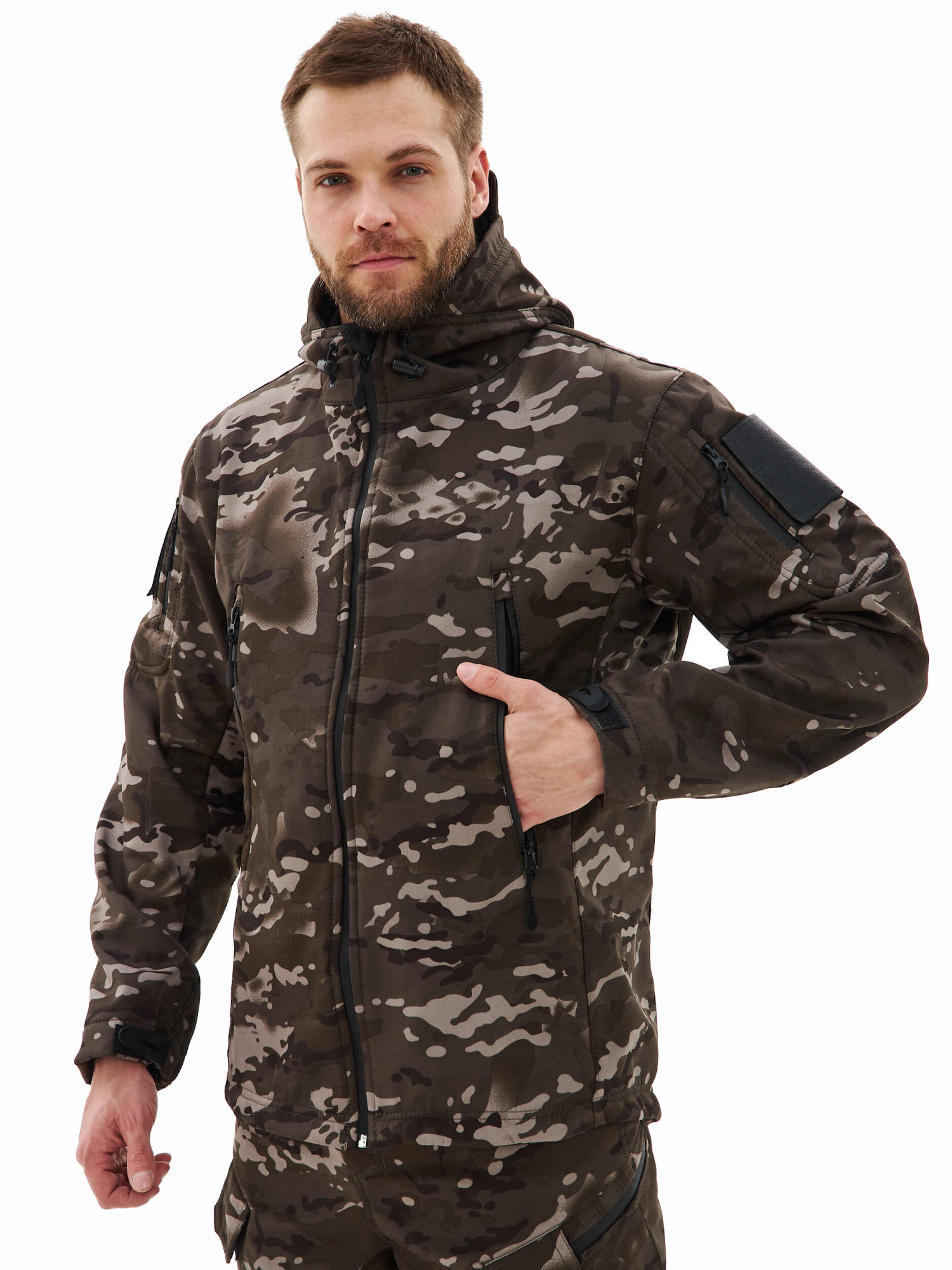 - прорезные карманы в рамку на рукавах со входом на молнию и ограничителями с двух сторон для замка, на кармане широкая липучка под шеврон;