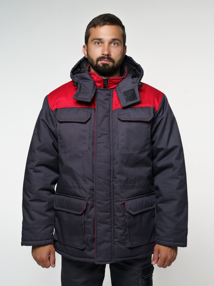 Куртка прямого силуэта, с центральной застежкой на молнию с ветрозащитной планкой на липучках. Нагрудные накладные карманы и нижние объемные накладные карманы-портфель с клапаном на липучках. В рукавах трикотажные манжеты-напульсники. По линии талии кулиса со шнуром-резинкой и фиксатором. Воротник-стойка. Съемный утепленный капюшон на пуговицах, по лицевому вырезу кулиса со шнуром-резинкой и фиксаторами, по лицевой части застегивается на липучки. Подкладка простегана с утеплителем, внутренний накладной карман на левой полочке.