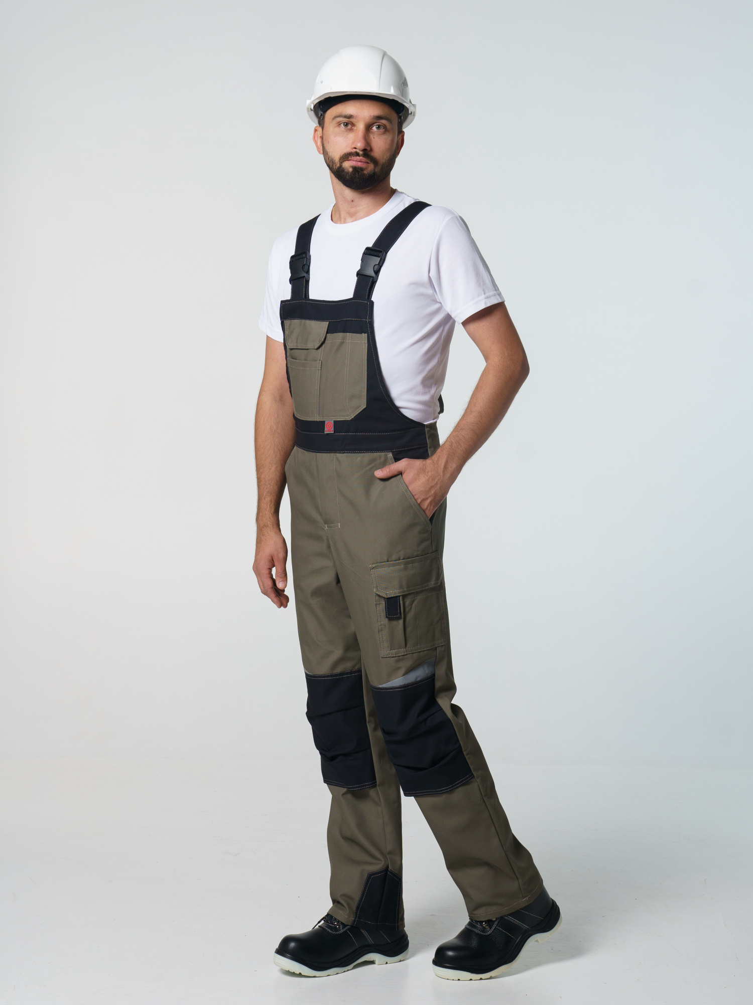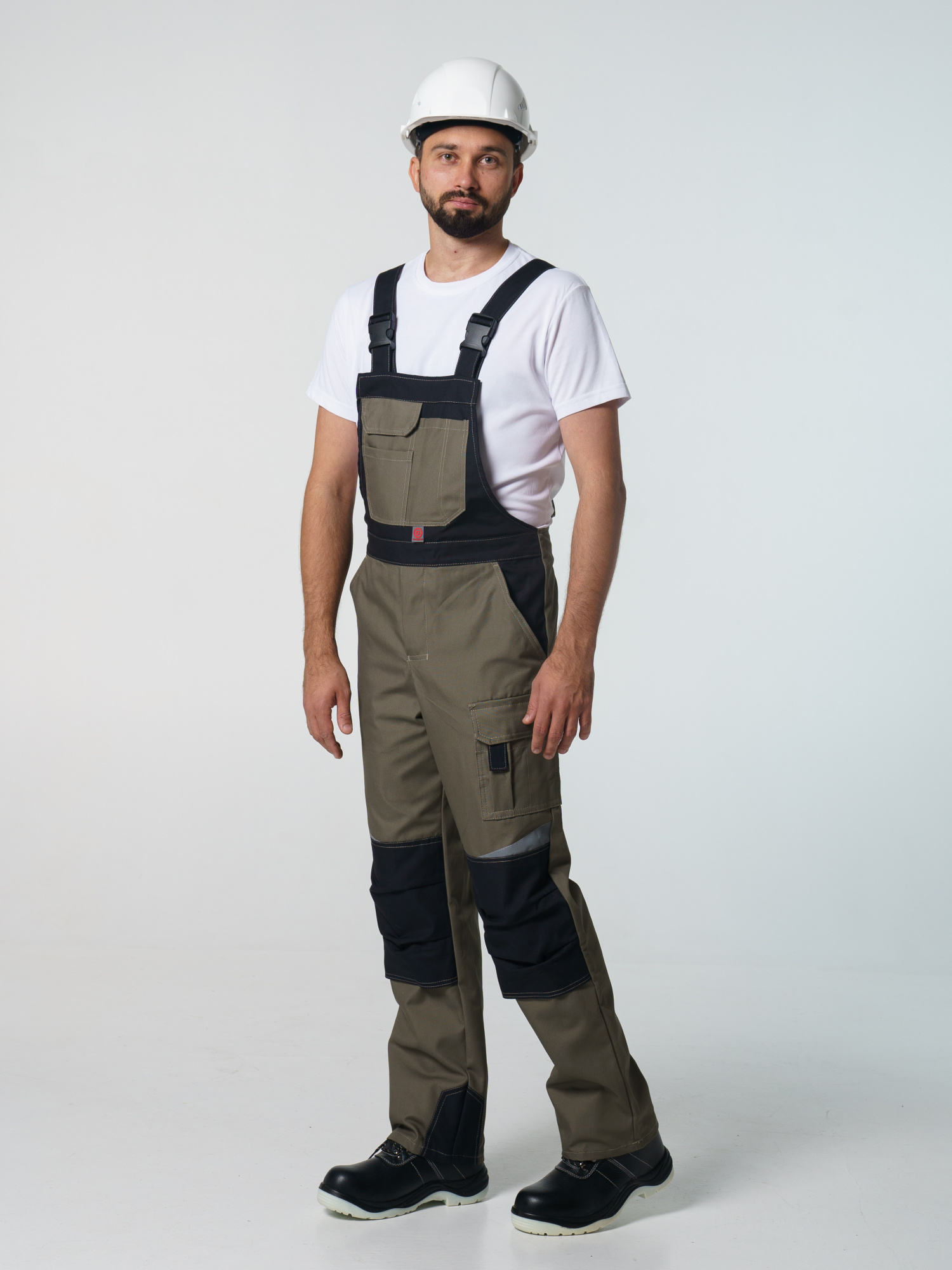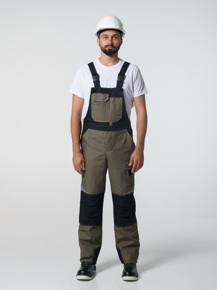 Полукомбинезон с застёжкой гульфика на молнию и застёжкой в боковом шве на пуговицы; с различными многофункциональными карманами; с объемными наколенниками. В полукомбинезоне предусмотрена лента светоотражающая (мелкодисперсная белая) 50 мм фигурной формы.