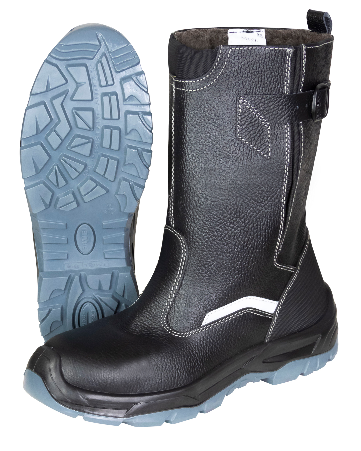 Голенище в сапогах "SAVEL-ДЖЕТ" из кожи, с помощью ремешка возможна регулировка по ширине, подкладка и вкладная стелька утеплённые, из шерстина. Имеются световозвращающие элементы для привлечения внимания и исключения несчастных случаев на производстве в темное время суток.